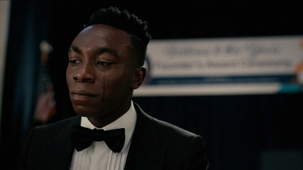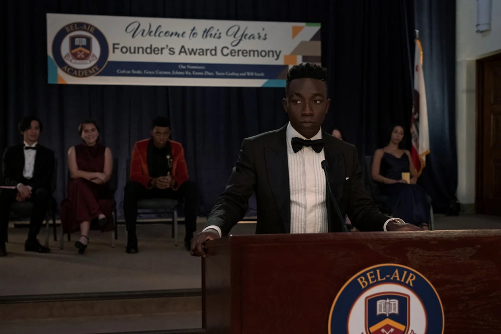 Ms. Bassin takes the stage to present the Founder's Award recipient. She explains that this award is Bel-Air Academy's most prestigious honor. For decades, it's been granted to a junior who exemplifies dignity, excellence, and leadership, and tonight it gives her great pleasure to present the award to Carlton. Everyone stands from their seats and applaud, except Ashley, which doesn't go unnoticed by Geoffrey. Will congratulates Carlton and says that his crown is waiting for him. Carlton takes the podium and thanks everyone in attendance, especially his family, but he then takes the time to apologize for leading them to believe that he's worthy of the award, when in reality, he's not. As tears roll down his face, Carlton admits to being high on coke most days. As Drew and Connor watch in disbelief from the crowd, Carlton admits that he knows how to say and do what he needs to get people to believe what he wants them to. He lies to his family every day and feels terrible for it, and he doesn't want to anymore, much to Geoffrey's relief. Carlton is no one's hero and apologizes one last time before walking off the stage, with his family following closely behind.